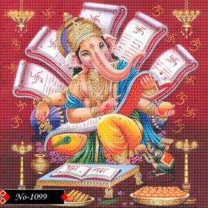 An intellectually divine portrayal of Lord Ganesha surrounded by ancient scriptures, symbolizing knowledge, wisdom, and learning. Set against a regal red backdrop, this vibrant artwork features Ganesha writing the sacred texts, with auspicious symbols and offerings completing the devotional ambiance. A perfect choice for students, teachers, and seekers of wisdom.