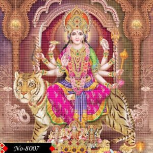 Seated upon a majestic tiger, Ambaji Maa radiates unmatched spiritual power. Her golden crown sparkles with jewels, symbolizing her supreme authority. Each arm carries a weapon gifted by the gods for her battle against Mahishasura. Her gaze is serene, filled with compassion for her devotees. The backdrop is adorned with soft golden light and the figures of her ninBeneath her feet are divine figures offering tribute, including Lakshmi and Saraswati. This powerful portrait blends devotion, myth, and artistic brilliance.