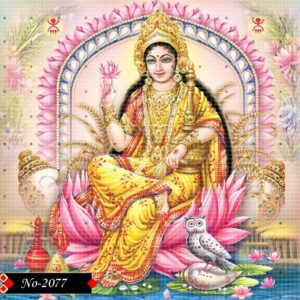 This image presents a serene depiction of Goddess Lakshmi, seated gracefully in a relaxed posture upon a large pink lotus. She is resplendent in golden-yellow attire, richly adorned with elaborate gold jewelry, including necklaces, armlets, and a crown. In her upper right hand, she delicately holds a pink lotus, symbolizing purity and beauty.