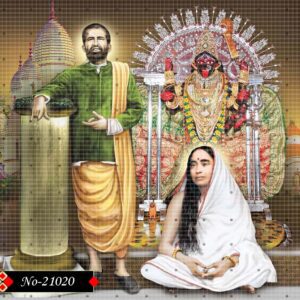 In this divine scene, the serene faces of Ramakrishna and Sarada Devi are bathed in celestial light, with the radiant form of Kali Maa in the background. The artwork resonates with spiritual purity and eternal devotion.