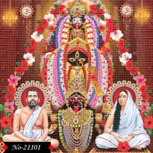 In this divine scene, the serene faces of Ramakrishna and Sarada Devi are bathed in celestial light, with the radiant form of Kali Maa and maa durga in the background. The artwork resonates with spiritual purity and eternal devotion.