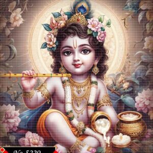 This enchanting digital artwork captures the serene presence of child Lord Krishna in a peaceful sitting posture playing flute. His adorable face radiates innocence and divinity, while golden jewelry and vibrant traditional attire reflect celestial grace. Set against a beautifully detailed background, the image exudes a soft spiritual glow, blending mythological richness with artistic elegance. A perfect embodiment of divine love, joy, and purity.
