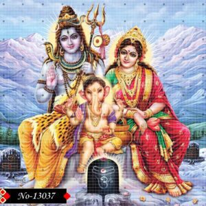 The holy image of Lord Shiva’s family radiates divine splendor, adorned with ornaments and divine attire that shimmer with celestial light. Lord Shiva’s meditative calmness is complemented by Parvati’s motherly affection, creating an atmosphere of balance and serenity. Lord Ganesha’s auspicious presence brings prosperity and wisdom. Together, this divine family becomes a guiding light of faith, purity, and eternal inspiration.