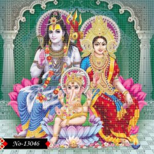 This divine image of Lord Shiva, Goddess Parvati, Lord Ganesha radiates an eternal light of holiness and grace. Their shining ornaments and splendid attire reflect purity, love, and sacred harmony. Lord Shiva’s calm and meditative presence brings peace, while Parvati’s nurturing aura adds warmth and compassion.