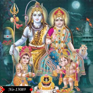 The holy image of Lord Shiva’s family radiates divine splendor, adorned with ornaments and divine attire that shimmer with celestial light. Lord Shiva’s meditative calmness is complemented by Parvati’s motherly affection, creating an atmosphere of balance and serenity. Lord Ganesha’s auspicious presence brings prosperity and wisdom, while Kartikeya’s bravery symbolizes strength and determination. Together, this divine family becomes a guiding light of faith, purity, and eternal inspiration.