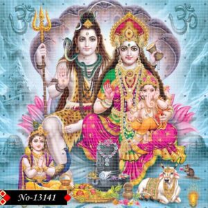 The holy image of Lord Shiva’s family radiates divine splendor, adorned with ornaments and divine attire that shimmer with celestial light. Lord Shiva’s meditative calmness is complemented by Parvati’s motherly affection, creating an atmosphere of balance and serenity. Lord Ganesha’s auspicious presence brings prosperity and wisdom, while Kartikeya’s bravery symbolizes strength and determination. Together, this divine family becomes a guiding light of faith, purity, and eternal inspiration.