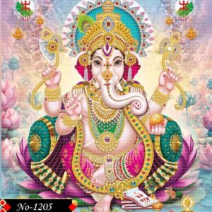 This divine illustration of Lord Ganesha radiates opulence and blessings. With traditional ornaments, expressive eyes, and symbolic items in his four hands, he exudes grace and spiritual power. The image is perfect for invoking divine blessings of success and positivity.