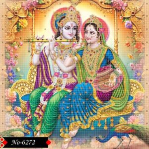 In this spiritual art, Krishna serenades Radha with his flute. They are dressed in rich, traditional attire with stunning detail and sit in a golden swing.