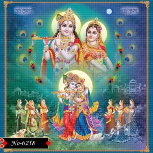 In this spiritual art, Krishna serenades Radha with his flute. They are dressed in rich, traditional attire with stunning detail.
