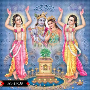 An aura of divinity surrounds Gour and Nitai as they dance with blissful surrender in this spiritual artwork. Radiant forms of Radha-Krishna anchor the scene in devotional strength and sacred tradition.