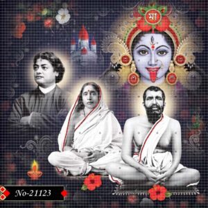 This powerful devotional image features Sri Ramakrishna Paramahamsa, Holy Mother Sarada Devi, and Swami Vivekananda, symbolizing the spiritual trinity of modern Indian spirituality. Behind them, the intense and divine face of Goddess Kali emerges in a radiant red and black form, reflecting cosmic energy and divine power. The expressions of the three saints convey calm wisdom, devotion, and unwavering spiritual strength.