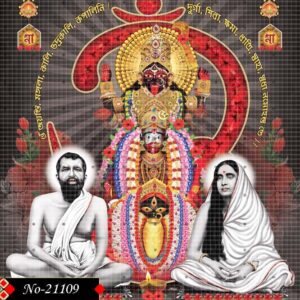 This spiritual artwork presents Ramakrishna Paramahamsa and Holy Mother Sarada Devi surrounded by a golden aura of peace. In the background, the majestic figure of Goddess Kali glows with celestial power, evoking profound devotion.