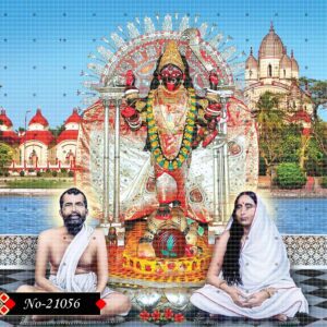 This spiritually rich image depicts Sri Ramakrishna Paramahamsa and Holy Mother Sarada Devi seated in meditative posture, radiating peace and devotion. At the center stands the powerful idol of Goddess Kali, richly adorned with divine ornaments and symbols of strength. The serene water body in the background adds a sense of calm and purity to the composition. Temple structures rise gracefully behind the goddess, enhancing the sacredness of the scene. The presence of the divine figures together evokes a deep sense of spiritual unity and reverence. This image beautifully captures the essence of devotion, divine energy, and inner awakening.
