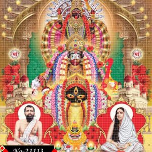 A spiritually rich image featuring Sri Ramakrishna and Holy Mother Sarada Devi, with the divine forms of Goddess Kali standing behind. The glowing background reflects enlightenment, purity, and heavenly peace.