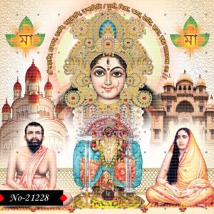 The holy presence of Sri Ramakrishna and Sarada Devi fills the frame, while the powerful image of Goddess Kali shines behind them. Golden hues wrap the figures, symbolizing divine love, strength, and inner peace.