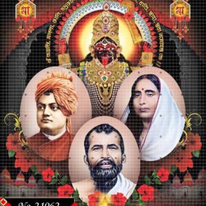 This divine image showcases Sri Ramakrishna Paramahamsa, Holy Mother Sarada Devi, and Swami Vivekananda, symbolizing the foundation of spiritual awakening and devotion. Behind them stands the radiant and majestic form of Goddess Kali, adorned in vibrant red garments, lavish jewelry, and surrounded by a celestial aura of divinity. Each figure radiates peace, wisdom, and the eternal power of Sanatan Dharma. The image beautifully blends devotion, meditation, and the presence of the Divine Mother. It serves as a powerful visual representation of inner enlightenment and divine connection.