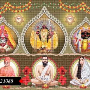 This divine image showcases Sri Ramakrishna Paramahamsa, Holy Mother Sarada Devi, and Swami Vivekananda seated in deep meditation, symbolizing the foundation of spiritual awakening and devotion. Behind them stands the radiant and majestic form of Goddess Kali, adorned in vibrant red garments, lavish jewelry, and surrounded by a celestial aura of divinity.