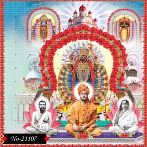 This divine image showcases Sri Ramakrishna Paramahamsa, Holy Mother Sarada Devi, and Swami Vivekananda seated in deep meditation, symbolizing the foundation of spiritual awakening and devotion. Behind them stands the radiant and majestic form of Goddess Kali, adorned in vibrant red garments, lavish jewelry, and surrounded by a celestial aura of divinity.