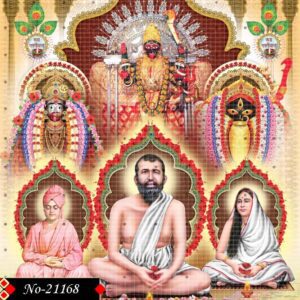 This powerful devotional image features Sri Ramakrishna Paramahamsa, Holy Mother Sarada Devi, and Swami Vivekananda, symbolizing the spiritual trinity of modern Indian spirituality. Behind them, the intense and divine face of Goddess Kali emerges in a radiant red and black form, reflecting cosmic energy and divine power. The expressions of the three saints convey calm wisdom, devotion, and unwavering spiritual strength.