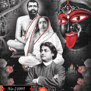 This powerful devotional image features Sri Ramakrishna Paramahamsa, Holy Mother Sarada Devi, and Swami Vivekananda, symbolizing the spiritual trinity of modern Indian spirituality. Behind them, the intense and divine face of Goddess Kali emerges in a radiant red and black form, reflecting cosmic energy and divine power. The expressions of the three saints convey calm wisdom, devotion, and unwavering spiritual strength.