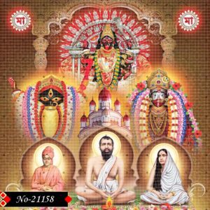 This powerful devotional image features Sri Ramakrishna Paramahamsa, Holy Mother Sarada Devi, and Swami Vivekananda, symbolizing the spiritual trinity of modern Indian spirituality. Behind them, the intense and divine face of Goddess Kali emerges in a radiant red and black form, reflecting cosmic energy and divine power. The expressions of the three saints convey calm wisdom, devotion, and unwavering spiritual strength.