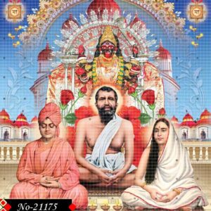 This powerful devotional image features Sri Ramakrishna Paramahamsa, Holy Mother Sarada Devi, and Swami Vivekananda, symbolizing the spiritual trinity of modern Indian spirituality.