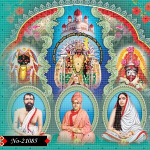 A devotional masterpiece, this image highlights Sri Ramakrishna, Sarada Devi, and Swami Vivekananda seated in calm meditation. Rising above them is the awe-inspiring image of Goddess Kali, magnificently adorned and surrounded by a powerful divine presence.