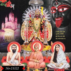 This powerful devotional image features Sri Ramakrishna Paramahamsa, Holy Mother Sarada Devi, and Swami Vivekananda, symbolizing the spiritual trinity of modern Indian spirituality. Behind them, the intense and divine face of Goddess Kali emerges in a radiant red and black form, reflecting cosmic energy and divine power. The expressions of the three saints convey calm wisdom, devotion, and unwavering spiritual strength.