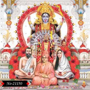 The holy presence of Sri Ramakrishna, Vivekananda and Sarada Devi fills the frame, while the powerful image of Goddess Kali shines behind them. Golden hues wrap the figures, symbolizing divine love, strength, and inner peace.