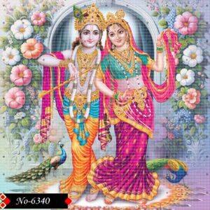 The close-up image reflects Radha and Krishna’s divine togetherness. Krishna’s calm, blue-toned face rests beside Radha’s radiant expression. Both are adorned with exquisite crowns and earrings. Colorful flowers like surround them. Their eyes seem to speak of timeless love and devotion. Every detail reflects grace, serenity, and devotion. This composition brings warmth and divinity to the heart. It symbolizes the perfect balance of love and devotion.