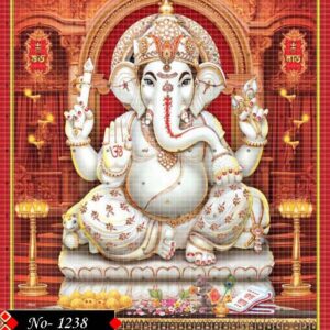 Divine idol of Lord Ganesha seated majestically in a traditional temple setting. The idol is made of white marble, adorned with intricate golden and red embellishments, and decorated with floral motifs. Lord Ganesha is in a blessing posture with one hand raised in Abhaya Mudra, holding a modak, a pen, and a scripture in other hands. A bright red velvet curtain backdrop with gold archways and ornate lamps on both sides frames the deity. Offerings of laddus, flowers, and sacred books are placed at the base of the idol. The overall color theme includes rich reds, glowing golds, and pristine whites. Highly detailed and spiritual aesthetic.