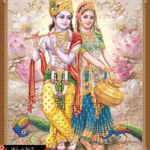 This holy image brings Radha and Krishna’s love to life. Ornaments and garlands enrich their divine aura.
