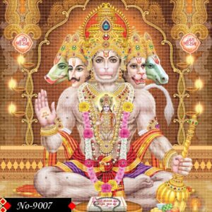 This image depicts the powerful and multi-headed form of Hanuman, known as Panchamukhi Hanuman, a significant deity in Hinduism. The central figure is Hanuman, adorned with elaborate golden crowns and intricate jewelry, including necklaces and armbands. He is seated with one leg bent, holding a mace (gada) on the ground beside him, symbolizing his strength and martial prowess.