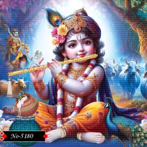 An enchanting visual of child Krishna, this artwork beautifully blends cultural heritage and digital artistry. With his gentle smile, decorative jewels, and traditional vibrant attire, the image evokes the magical tales of Vrindavan and the purity of divine love.