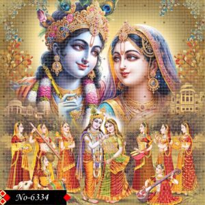 The artwork beautifully captures Radha and Krishna in a moment of divine togetherness. Their faces are illuminated with gentle smiles and sparkling eyes. Krishna’s skin radiates divine blue light, framed by his golden crown. Radha is adorned with delicate ornaments and pink floral garlands. Their serene expressions evoke peace and devotion. This image reflects the purity of their eternal bond.