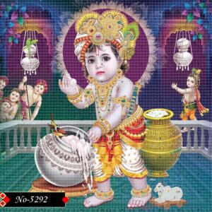 This enchanting digital artwork captures the serene presence of child Lord Krishna in a peaceful standing posture. His adorable face radiates innocence and divinity, while golden jewelry and vibrant traditional attire reflect celestial grace. Set against a beautifully detailed background.