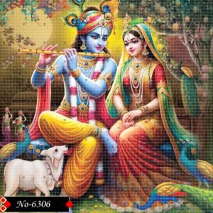 The divine couple Radha Krishna sits under a leafy canopy, sharing a musical bond.