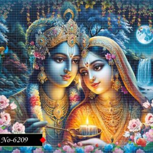 This captivating image portrays Radha and Krishna in a serene night-time setting, illuminated by a soft glow. Krishna, with his distinctive blue skin, is on the left, adorned with an elaborate golden crown, floral garlands, and intricate jewelry. Radha, on the right, gazes softly, her golden attire and jewelry reflecting the warm light. She wears a delicate head covering and is also richly ornamented with flowers and jewels. In the foreground, a lit diya (oil lamp) or candle casts a warm glow, symbolizing devotion and light. The background features a mystical landscape under a full moon, with a flowing waterfall and silhouetted trees creating a tranquil atmosphere. A small peacock is visible on the left, adding to the natural beauty of the scene. The entire image is framed by delicate pink and blue flowers, enhancing its romantic and divine aura.