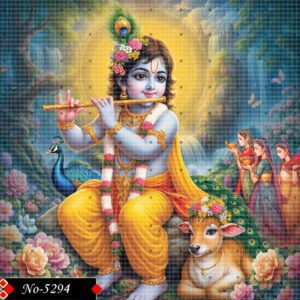 This colorful image depicts a young Lord Krishna, with his characteristic blue skin, playing a golden flute. He is adorned with a peacock feather in his crown, floral garlands, and traditional golden jewelry. He is seated gracefully amidst a lush, vibrant landscape teeming with flowers, a peacock, and a serene calf with a flower garland around its neck.