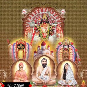 This powerful devotional image features Sri Ramakrishna Paramahamsa, Holy Mother Sarada Devi, and Swami Vivekananda, symbolizing the spiritual trinity of modern Indian spirituality. Behind them, the intense and divine face of Goddess Kali emerges in a radiant red and black form, reflecting cosmic energy and divine power. The expressions of the three saints convey calm wisdom, devotion, and unwavering spiritual strength. The monochrome tones with red highlights emphasize the sacred and timeless nature of the scene.