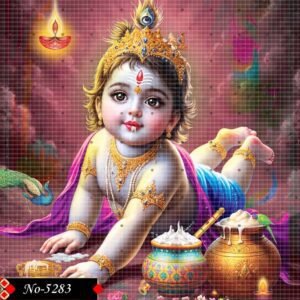 In front of him are two traditional Indian pots; one, colorful and decorative, contains a dollop of white, possibly butter or yogurt, while the other, golden, also holds a similar white substance. To the left, a peacock’s head and tail feathers are subtly visible. The background is a soft, colorful blend of pinks, purples, and blues, with ethereal patterns and a glowing diya (oil lamp) in the top left corner, adding to the spiritual and mystical ambiance.