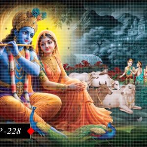 A spiritually rich poster showing Radha and Krishna in divine embrace.