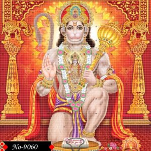 This vibrant depiction of Lord Hanuman in a kneeling posture shows the perfect blend of strength and submission. His grand crown, pearl necklaces, and floral malas glorify his divine form. His right hand raised in blessing speaks to his role as a protector and guide. The left holds a heavy golden mace, his symbol of divine might. His chest bears the image of Lord Ram, signifying where his heart and soul reside.
