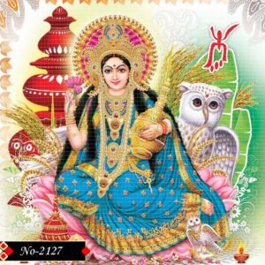This vibrant devotional image features Goddess Lakshmi, adorned in a colorful saree, seated on a prominent pink lotus. She holds a golden pot in one hand and offers a blessing gesture with the other. An owl, her traditional vehicle, sits at the bottom, alongside an overflowing pot symbolizing prosperity.