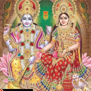 This ethereal representation of Vishnu and Lakshmi brings forth the message of sustenance and prosperity. Vishnu’s regal pose and divine ornaments signify protection and guidance, while Lakshmi’s graceful form reflects nurturing abundance. A perfect spiritual depiction to inspire faith in the eternal forces of good.