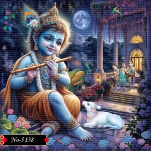 This spiritual image of Lord Krishna features a cute, expressive face and an elegant sitting pose, playing flute at night, framed in shimmering golden jewelry and richly hued garments. The soft glow and divine background make it a soul-stirring representation of purity and faith.