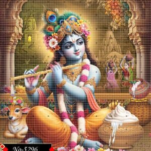 This colorful image depicts a young Lord Krishna, with his characteristic blue skin, playing a golden flute. He is adorned with a peacock feather in his crown, floral garlands, and traditional golden jewelry. He is seated gracefully. In the background, a circular halo of light emanates from behind Krishna, highlighting his divine presence.